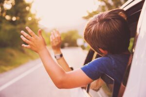Family summer trip driving by suv car enjoying the road in the Catalan Pyrenees with hands on the road breeze.