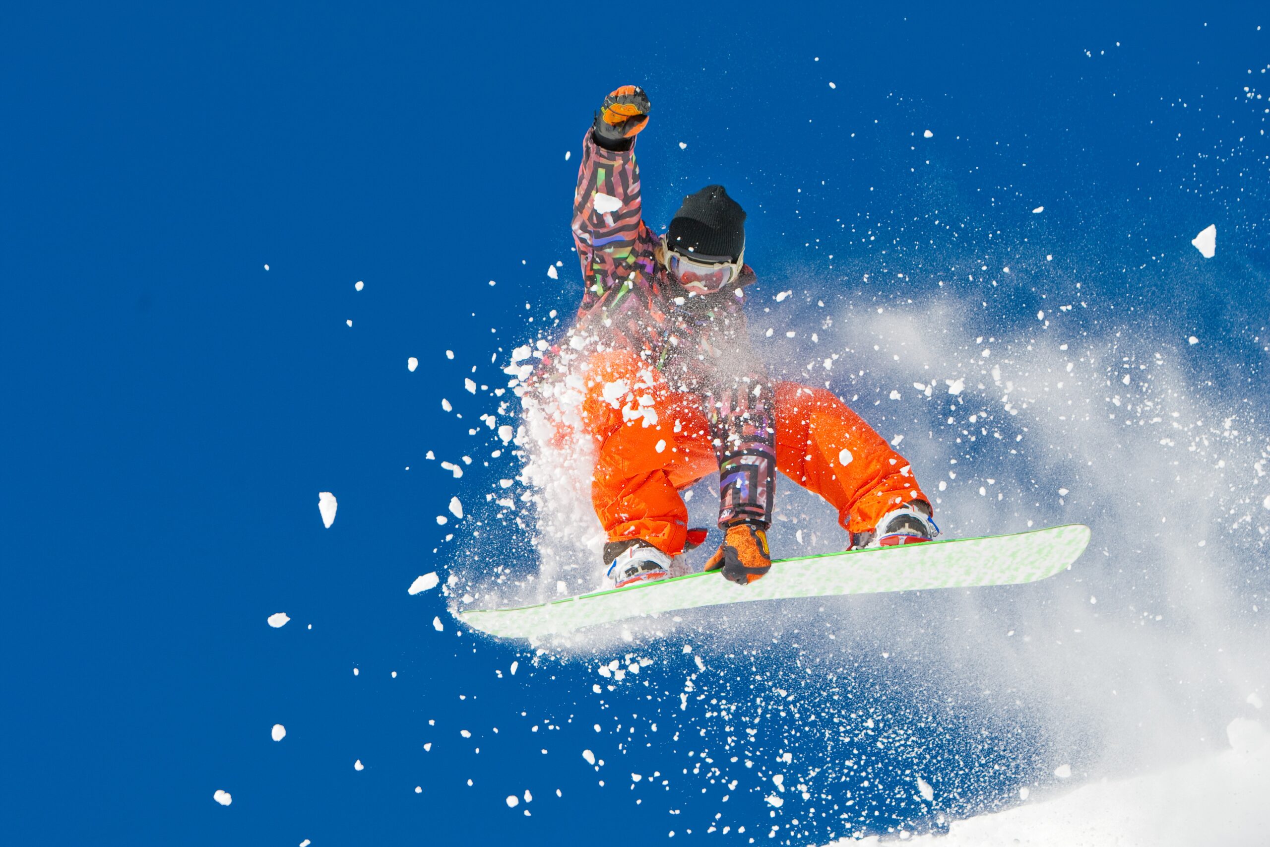 Jumping snowboarder with clouds of snow.